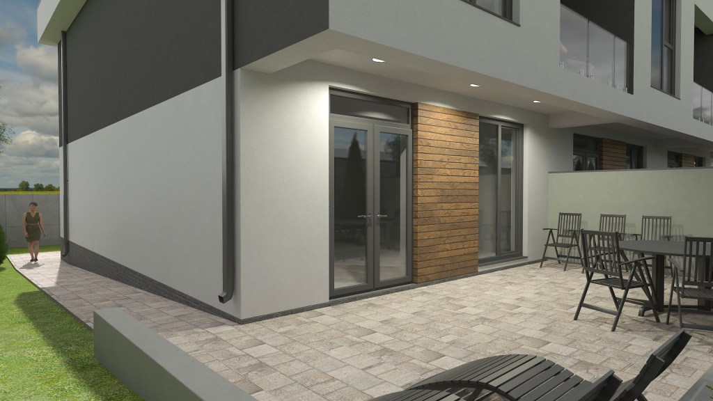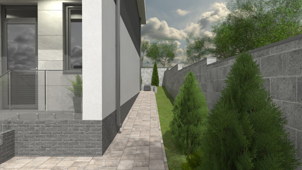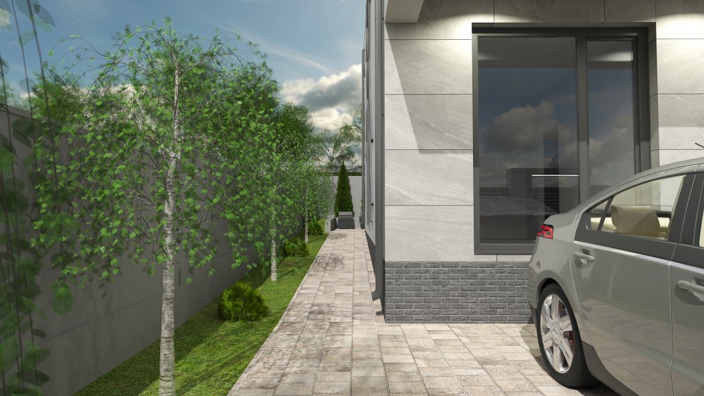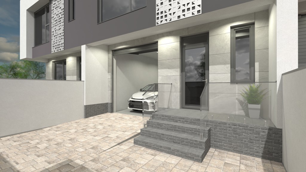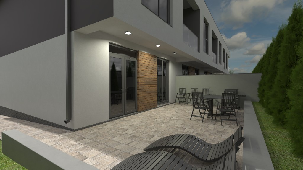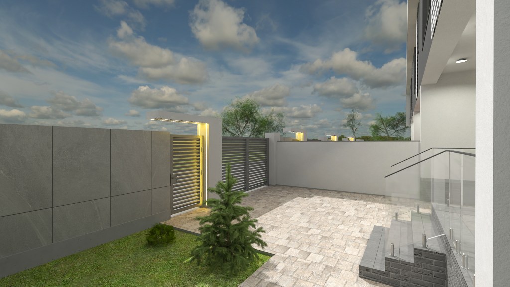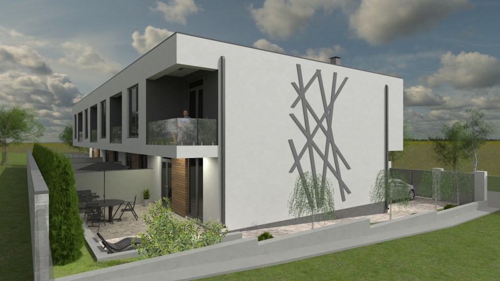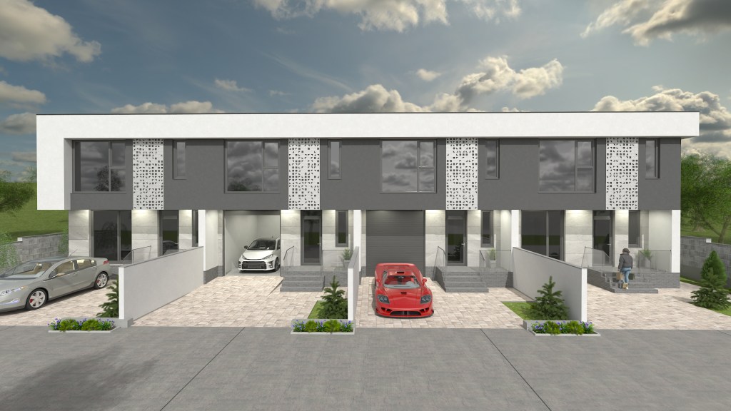 Four houses connected to each other, separated by brick walls; in Gratiesti, a suburb of the city of Chisinau.